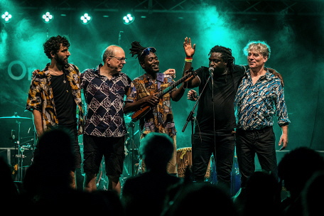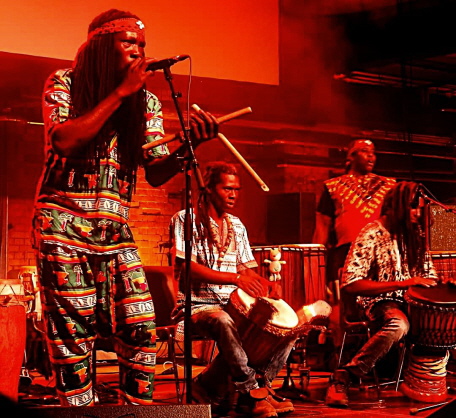mit Meistertrommler Tonton aus Guinea, Coraspieler Aziz Kuyate aus Gambia und mit Nadja und Ndiankou an den Bass-Sets